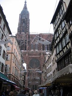Strassburg, a beautiful town and a magnificent cathederal in the middle of town. This was the coldest day of our trip - overcast, sleeting and a freezing cold wind.